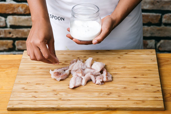 Inzwischen das Seelachsfilet in ca. 2–3cm große Stücke schneiden und mit Salz würzen. Vorsicht! Der Fisch kann Gräten besitzen. Diese am besten mit einer Pinzette oder einer Flachzange herausziehen. Ansonsten einfach beim Essen auf die Gräten achten.