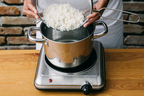 In einem mittelgroßen Topf 800ml leicht gesalzenes Wasser aufkochen. Den Reis in einem Sieb unter fließendem Wasser abspülen, bis das Wasser klar bleibt. Sobald das Wasser kocht, den Reis auf niedrigster Stufe abgedeckt ca. 10–12Min. kochen, bis das Wasser komplett aufgesogen und der Reis gar ist. Noch ca. 5Min. ohne Hitzezufuhr abgedeckt ziehen lassen.