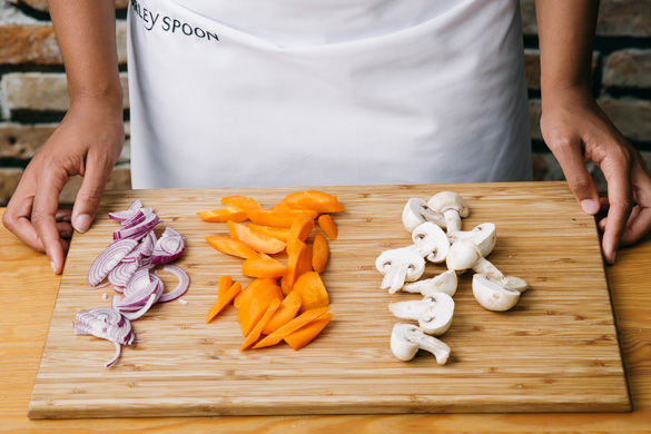 Währenddessen die Champignons ggf. mit Küchenpapier oder einer Bürste säubern und je nach Größe vierteln oder achteln. Die Karotten schälen, längs halbieren und in ca. 1cm breite, schräge Scheiben schneiden. Die Zwiebel schälen, halbieren und in feine Halbringe schneiden.