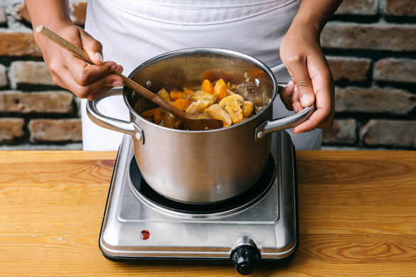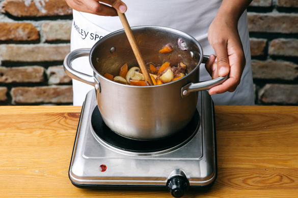 Die Zwiebeln in einem großen Topf mit 1–2EL Pflanzenöl bei mittlerer bis starker Hitze ca. 1 Min scharf anbraten, dann die Champignons und die Karotten hinzufügen und ca. 3–4Min. mitbraten.