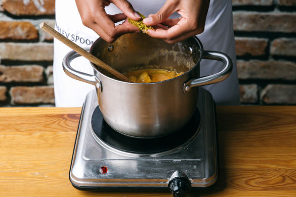 Die 1/2 der Currypaste unterrühren und kurz mitbraten, dann mit der Kokosmilch und 100ml Wasser ablöschen. Den Brühwürfel hineinbröseln und das Curry ca. 5–6Min. auf mittlerer Hitze köcheln lassen.