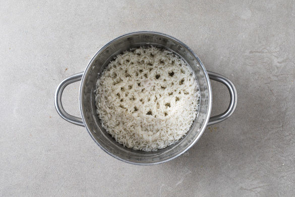 Den Reis in einem Sieb kalt abspülen, bis das Wasser klar bleibt. Sobald das Wasser kocht, den Reis hineingeben und abgedeckt bei niedrigster Hitze 10–12Min. kochen, bis das Wasser aufgesogen und der Reis gar ist. Noch ca. 5Min. ohne Hitzezufuhr ziehen lassen.