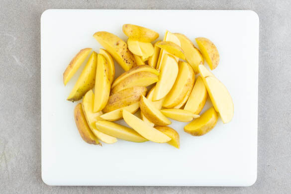 Den Backofen auf 220°C (200°C Umluft) vorheizen. Die Kartoffeln samt Schale in ca. 1,5cm breite Spalten schneiden.