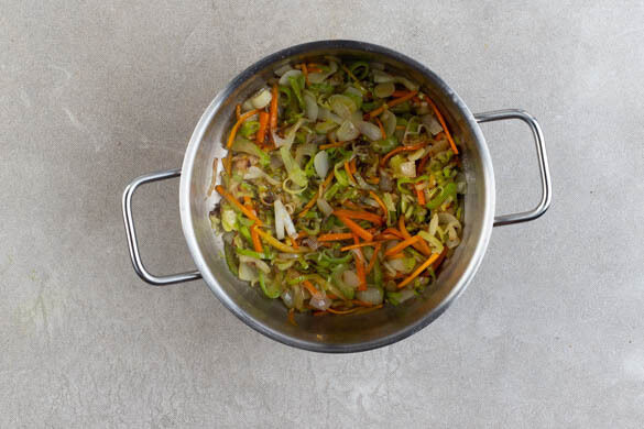 Die Fenchelsamen und den Gemüsemix in einem mittelgroßen Topf mit 2TL Olivenöl bei starker Hitze 3–5Min. anbraten, bis das Gemüse goldbraun ist.