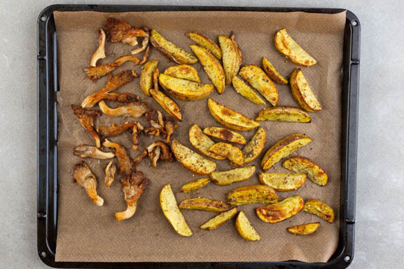 Die Kartoffeln auf einem mit Backpapier ausgelegten Backblech mit 2EL Olivenöl, der Gewürzmischung sowie je 1 kräftigen Prise Salz und Pfeffer vermengen und gleichmäßig verteilen. Die Kartoffeln 20–25Min. im Ofen backen, nach der Hälfte der Zeit wenden. Die Pilze auf ein zweites mit Backpapier ausgelegtes Blech legen und für den Rest der Zeit über den Kartoffeln mitbacken.