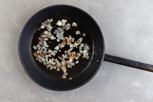 Die Zwiebel schälen, halbieren und grob würfeln. Die Zwiebelwürfel in einer großen Pfanne mit 1EL Olivenöl bei mittlerer bis starker Hitze in 3–5Min. glasig anschwitzen, dabei gelegentlich umrühren. Tipp: Wer mag, kann auch einen Wok verwenden.