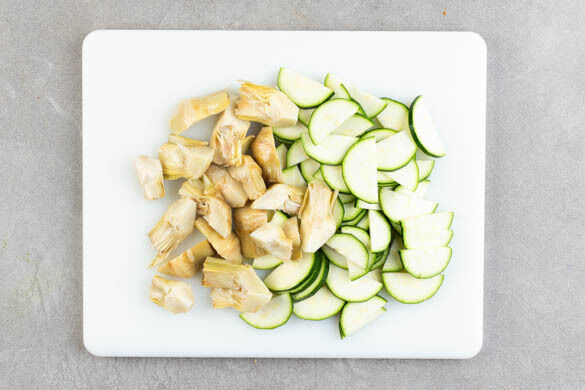 Die Zucchini längs halbieren und quer in dünne Scheiben schneiden. Die Artischocken in einem Sieb mit kaltem Wasser abspülen, abtropfen lassen und vierteln.