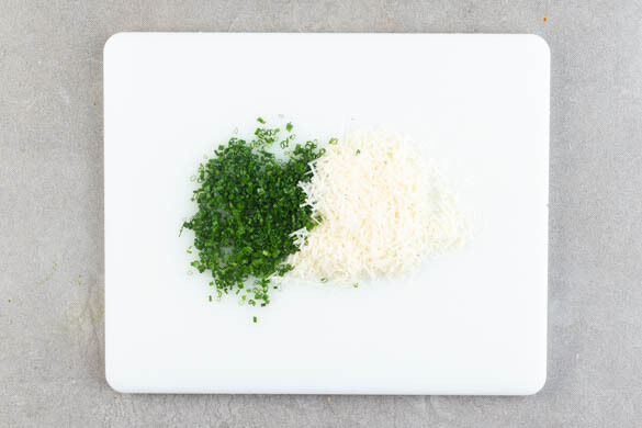 Den Käse fein reiben und den Schnittlauch in feine Röllchen schneiden.