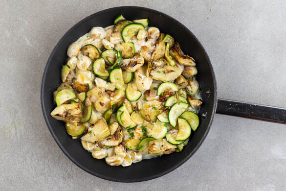 Wir finden ja, man sollte sich öfter mal etwas Gutes tun – und dafür haben wir dieses luxuriös-cremige Gericht kreiert. Falls du dir also mal einen großen Teller Soulfood gönnen möchtest, solltest du heute zuschlagen. Feine Gnocchi suhlen sich zusammen mit gebratener Zucchini und zarten Artischocken in einer vollmundigen Sauce aus Crème fraîche, Schnittlauch und Käse. Zum Schluss wird mit aromatischem Trüffelöl nicht gegeizt …