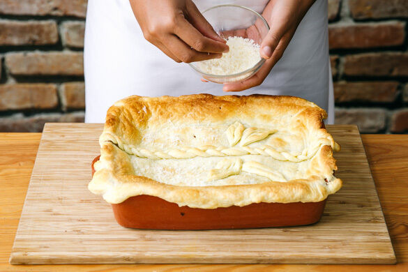 Das Gemüse in eine mittelgroße Auflaufform geben, dabei ggf. Flüssigkeit im Topf lassen. Den Blätterteig ausrollen und passend auf die Form legen, die Ränder umklappen und überlappenden Teig abschneiden. Tipp: Die Teigreste in hübschen Formen dekorativ auf der Teigdecke verteilen.