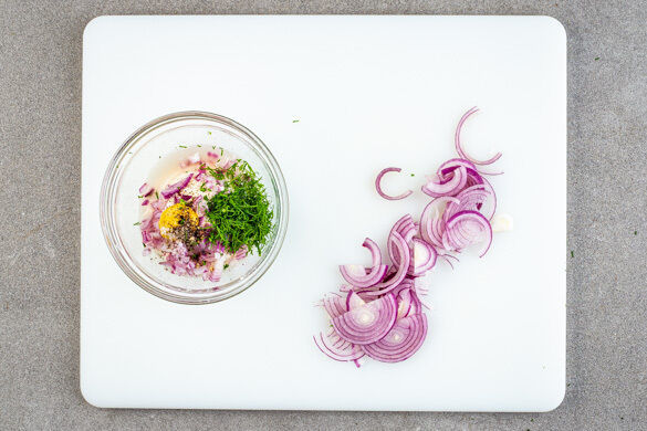 Den Dill samt Stängeln fein schneiden. Die Zwiebel schälen, halbieren und eine Hälfte in dünne Streifen schneiden, die andere Hälfte fein würfeln. Die Zwiebelwürfel mit dem Dill, 4EL Mayonnaise, 1TL Senf, ½TL hellem Essig und je 1 Prise Salz und Pfeffer verrühren. Die Remoulade bis zum Servieren im Kühlschrank kalt stellen.