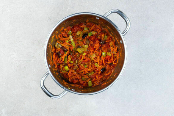 Den Lauch und die Karotten in einem zweiten Topf mit 2EL Olivenöl bei mittlerer Hitze ca. 2Min. anschwitzen. Den Knoblauch, die Oliven und die Gewürzmischung unterrühren und ca. 1Min. mitbraten. Dann die gehackten Tomaten unterrühren.