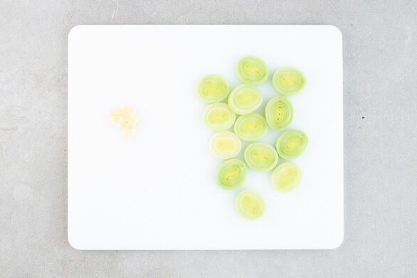 In einem großen Topf ausreichend leicht gesalzenes Wasser für die Pasta aufsetzen. Den Knoblauch schälen und fein würfeln. Den Lauch in dünne Scheiben schneiden.