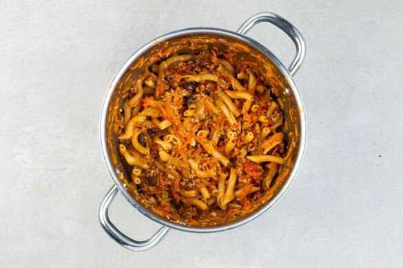 Das Hackfleisch zum Gemüse in den Topf geben, gut unterrühren und die Sauce 10–12Min. bei niedriger bis mittlerer Hitze sanft köcheln lassen.
