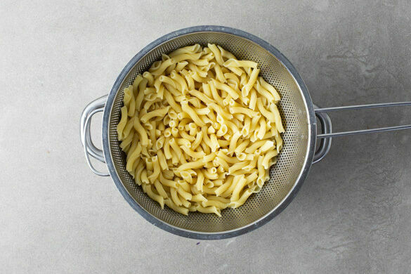 Die Pasta in das kochende Wasser geben und in 6–8Min. bissfest kochen. Mit einer Tasse etwas Kochwasser abschöpfen, dann die Pasta in ein Sieb abgießen und abtropfen lassen.