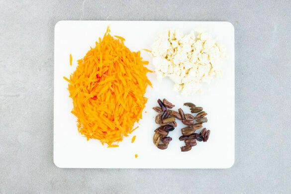 Die Karotten ggf. schälen und mit einer Küchenreibe grob raspeln. Die Oliven ggf. abtropfen lassen und halbieren. Den Feta mit den Fingern oder einer Gabel zerkrümeln.