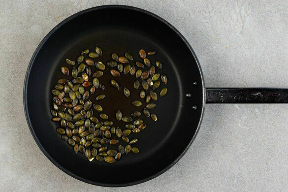 Die Kürbiskerne in einer großen Pfanne ohne Zugabe von Fett unter ständigem Rühren Fett 3–4Min. anrösten. Aus der Pfanne nehmen und beiseitestellen, die Pfanne aufbewahren.
