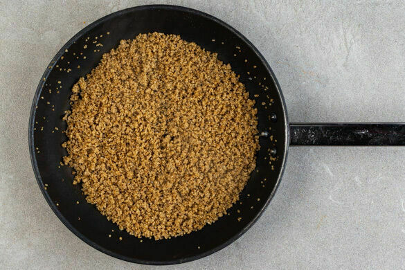 In der Kürbiskernpfanne das Fleisch mit 2EL Pflanzenöl bei mittlerer bis starker Hitze auf jeder Seite 2–3Min. anbraten, samt ausgetretenem Saft aus der Pfanne nehmen und kurz beiseitestellen. Die Pfanne nicht auswischen.