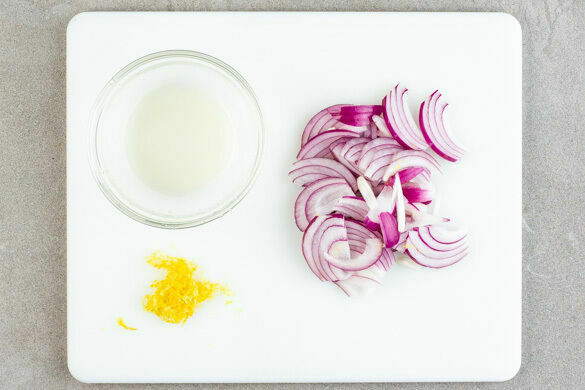 Die Zwiebeln schälen, halbieren und in feine Streifen schneiden. Die Zitronenschale abreiben, dann die Zitrone halbieren und auspressen.