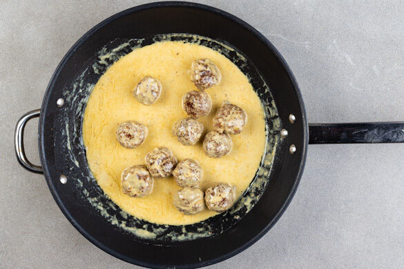 Die Hackbällchen in einer großen Pfanne mit 1EL Pflanzenöl bei mittlerer bis starker Hitze 4–5Min. von allen Seiten goldbraun braten. Dann bei niedriger Hitze langsam die restliche Sahne und die ½ des Brühgewürzes dazugeben und die Sauce ca. 2Min. köcheln lassen. Mit ggf. mehr Brühgewürz abschmecken.
