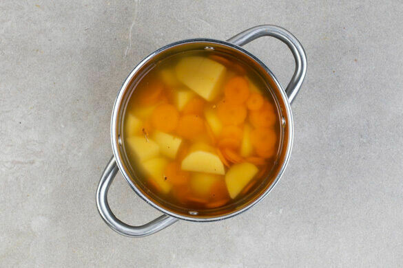 Die Kartoffeln und die Karotten in das kochende Wasser geben und in 12–15Min. bissfest kochen. Mit einer Tasse etwas Kochwasser abschöpfen, dann das Gemüse in ein Sieb abgießen und abtropfen lassen. Die Kartoffeln und die Karotten zurück in den Topf geben und abgedeckt warm halten.