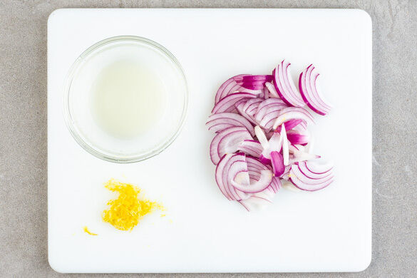 Die Zwiebel schälen, halbieren und in feine Streifen schneiden. Die Zitronenschale abreiben, dann die Zitrone halbieren und auspressen.