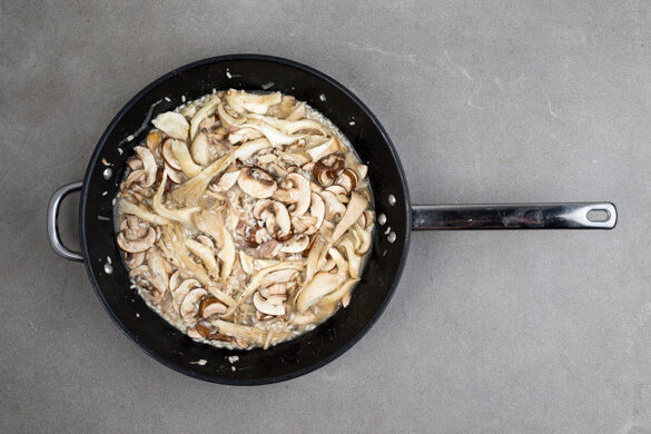 Nebenher die Pilze ggf. säubern. Die Austernpilze in dünne Streifen zupfen, die Champignons in dünne Scheiben schneiden. Die Pilze in das Risotto rühren, dann weiter portionsweise Brühe angießen und unter Rühren verköcheln lassen, bis der Reis gar ist. Nach 18–20Min. sollte das Risotto fertig sein.