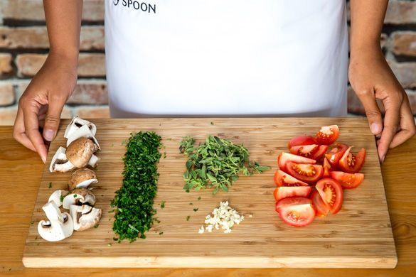 Den Ofen auf ca. 200°C Umluft oder 220°C Ober-/Unterhitze vorheizen. Die Tomaten achteln. Den Knoblauch schälen und fein hacken. Den Oregano vom Stängel zupfen, die Petersilie mit Stängeln fein hacken. Die Pilze mit einer Bürste oder etwas Küchenkrepp von evtl. Schmutz befreien und vierteln.