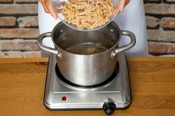 Inzwischen ausreichend gesalzenes Wasser für die Pasta in einem mittleren Topf zum Kochen bringen. Sobald das Wasser kocht, die Pasta für ca. 7-8Min. bissfest kochen, abgießen und kalt abschrecken. Im gleichen Topf die Dosentomaten erwärmen.