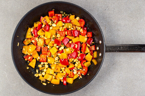 Die Paprika vierteln, entkernen und in 1–2cm große Stücke schneiden, dann in einer mittelgroßen Pfanne mit 1EL Olivenöl und 1/2TL Salz bei mittlerer bis starker Hitze in 5–7Min. weich braten.
