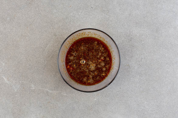 Den Knoblauch schälen, fein würfeln und mit der ½ des Ketjap Manis, der Ingwer-Würzsauce, 1TL Honig und 2EL Wasser verrühren. Tipp: Wer mag, kann auch mehr Ketjap Manis verwenden.