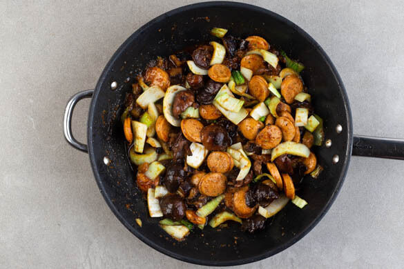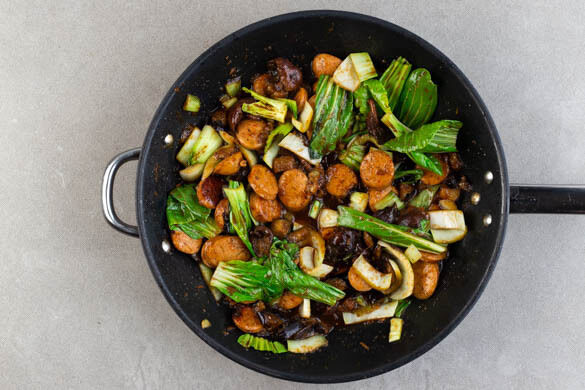 Die Wurstscheiben, die Pilze und die weißen Pak-Choi-Streifen mit 1EL Pflanzenöl zu den Auberginen geben und 3–5Min. mitbraten. Die Sauce angießen und bei niedriger Hitze 2–3Min. köcheln lassen.