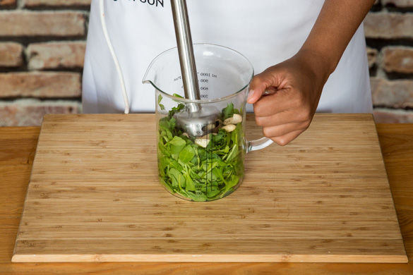 Nun den Spinat mit der Petersilie, Knoblauch, den restlichen Mandeln, 1-2EL Zitronensaft und 1El Olivenöl mit einem Stabmixer zu einer Pesto pürieren, mit Salz und Pfeffer und ggfs. mehr Zitronensaft abschmecken. Ggfs. etwas Wasser hinzufügen, bis das Pesto die gewünschte Konstsitenz hat.