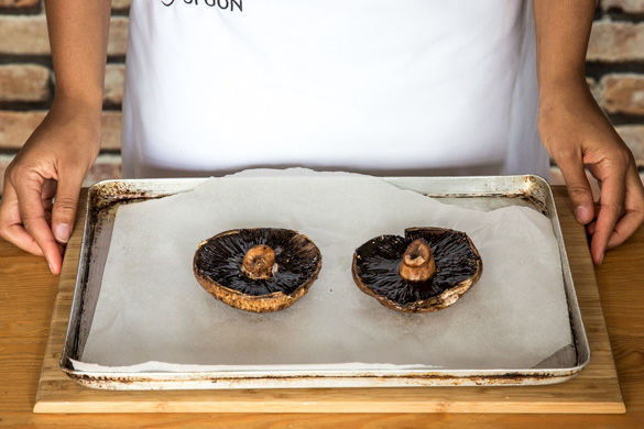 Zur Hälfte der Backzeit, das Gemüse im Ofen einmal wenden. Die marinieren Pilze auf ein zweites, mit Backpapier ausgelegtes Backblech mit dem Deckel nach unten legen und über dem Gemüse im Ofen für ca. 10-12Min. mitrösten.