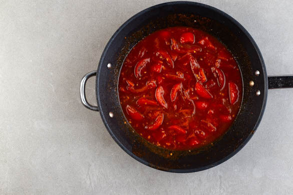 Den Knoblauch schälen, grob würfeln und unter das Gemüse rühren. Die passierten Tomaten mit 250ml Wasser und 1EL Zucker hinzufügen, aufkochen und bei mittlerer Hitze 4–5Min. köcheln lassen.