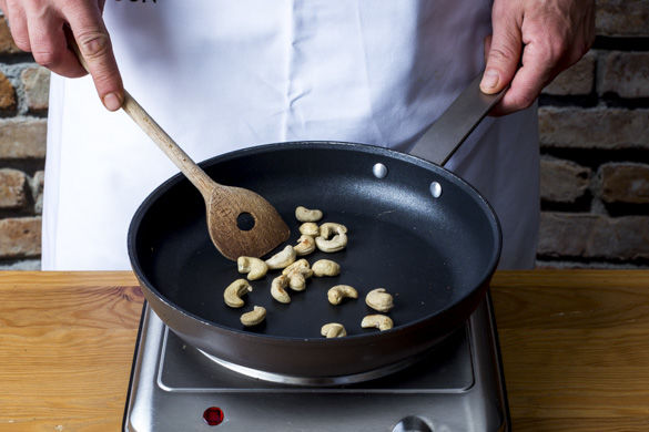 In der Zwischenzeit die getrockneten Aprikosen fein hacken. Die Cashews in einer kleinen Pfanne bei niedriger Hitze ohne Zugabe von Fett 1–2Min. anrösten, bis sie anfangen zu duften. Vorsicht, die Cashews können schnell anbrennen!