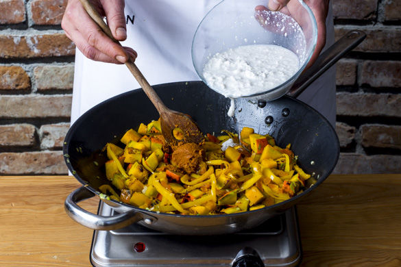 Die Aprikosen, die 1/2 der Currypaste und die Kokosmilch zum Gemüse geben und alles auf niedriger Hitze weitere 10–12Min. sanft köcheln lassen, bis der Kürbis gar ist. Mit Salz und Pfeffer abschmecken. Tipp: Wer es gerne schärfer mag, kann die ganze Currypaste verwenden.