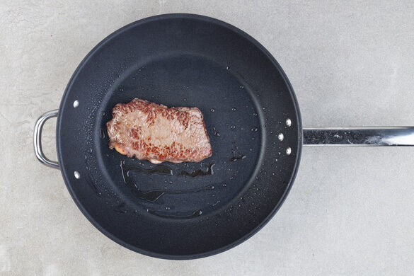 Das Fleisch trocken tupfen und in einer mittelgroßen Pfanne mit 1EL Pflanzenöl bei starker Hitze auf jeder Seite 2–3Min. braten, abhängig davon, ob es medium oder eher durchgebraten sein soll. Aus der Pfanne nehmen und bis zum Servieren auf einem Teller abgedeckt ruhen lassen.