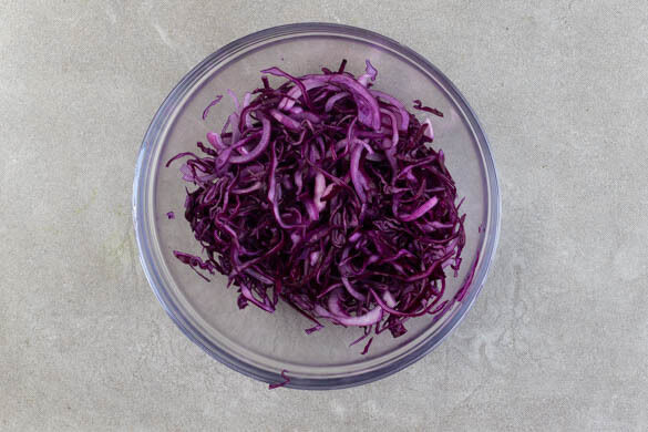 Einen großen Topf mit Wasser bis unter den Dampfkorb füllen und das Wasser zum Kochen bringen. Tipp: Statt dem Dampfkorb kann auch ein passendes Sieb verwendet werden. Die Zwiebeln schälen, halbieren und in dünne Streifen schneiden. Den Rotkohl fein schneiden und mit je ½TL Salz und Zucker, den Zwiebeln und 4EL Essig verkneten und mit Salz und Pfeffer abschmecken.