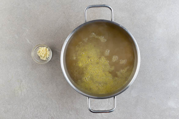 Den Backofen auf 200°C (180°C Umluft) vorheizen. In einem großen Topf ausreichend Wasser mit dem Brühgewürz für die Pasta zum Kochen bringen. Den Knoblauch schälen und sehr fein würfeln oder durch eine Knoblauchpresse drücken.