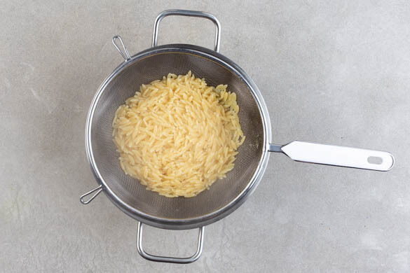 Die Pasta in das kochende Wasser geben und in 7–10Min. bissfest kochen. Mit einem Messbecher 350ml Pastawasser abschöpfen, dann die Pasta in ein Sieb abgießen und abtropfen lassen. Zurück in den Topf geben und abgedeckt warm halten.