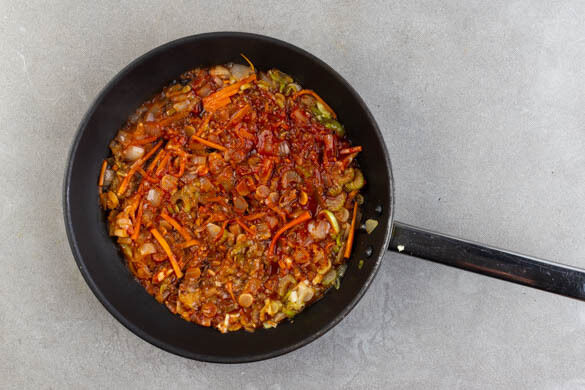 Den Gemüsemix in einer mittelgroßen, ofenfesten Pfanne mit 1EL Olivenöl und 1 kräftigen Prise Salz bei mittlerer Hitze 7–9Min. anbraten, bis die Zwiebeln glasig und leicht gebräunt sind. Tipp: Wer keine ofenfeste Pfanne hat, kann eine normale Pfanne verwenden und das Gemüse später in eine Auflaufform geben.