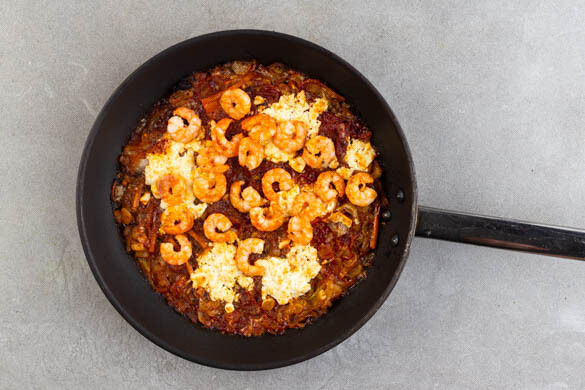 Die Garnelen in einem Sieb mit kaltem Wasser abspülen und mit etwas Küchenkrepp trocken tupfen, dann auf dem Gemüse in der Pfanne verteilen und mit 1 Prise Salz würzen. Den Feta darüber zerkrümeln, die Pfanne in den Ofen schieben und das Saganaki 4–7Min. backen, bis die Garnelen gar sind und der Feta goldbraun ist.