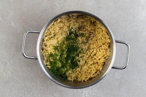 Den Dill samt Stängeln grob schneiden. Die Pasta mit der ½ des Dills, 1EL Olivenöl, 1EL Essig und 1 Prise Pfeffer verfeinern. Die Pasta auf Teller verteilen und das Gemüse und die Garnelen darauf anrichten. Mit dem restlichen Dill garnieren und servieren.