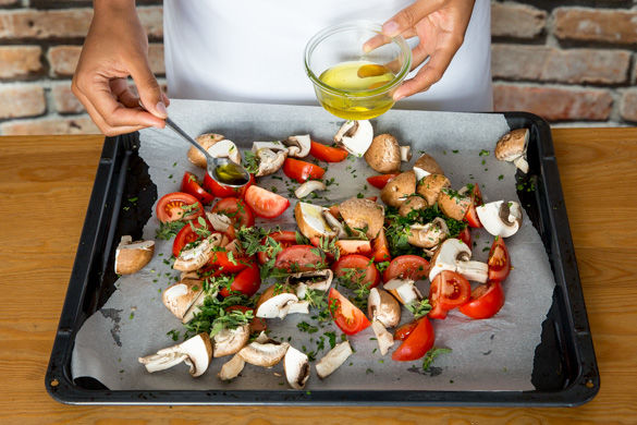 Den Ofen auf ca. 200°C Umluft oder 220°C Ober-/Unterhitze vorheizen. Die Tomaten achteln. Den Knoblauch schälen und fein hacken. Den Oregano vom Stängel zupfen, die Petersilie mit Stängeln fein hacken. Die Pilze mit einer Bürste oder etwas Küchenkrepp von evtl. Schmutz befreien und vierteln.