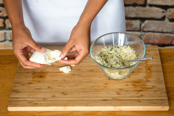 Den Panko mit 1/3 der Petersilie, 1-2EL Olivenöl, Salz und Pfeffer mischen. Den Mozzarella mit den Händen fein zerpflücken.