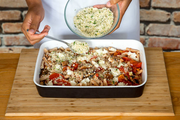 Ein einfaches Gericht, das kleine Pasta-Liebhaber begeistern wird. Dieser vegetarische Nudel-Auflauf bekommt durch das Backen eine goldgelb-geröstete Panko-Kruste für den Extra “Crunch” beim Essen. Der zartschmelzende Mozzarella versteckt sich zwischen Tomaten und Pilzen und rundet das ganze Gericht ab.