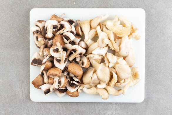 Die Champignons ggf. säubern und je nach Größe halbieren oder vierteln, die Austernpilze ganz lassen. Tipp: Pilze am besten mit etwas Küchenkrepp säubern, nicht mit Wasser abspülen.
