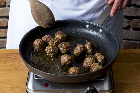Jetzt mit den Händen ca. 2cm große Hackbällchen formen und mit 1EL Olivenöl für ca. 2-3Min. von jeder Seite in einer großen Pfanne auf mittlerer Hitze anbraten.