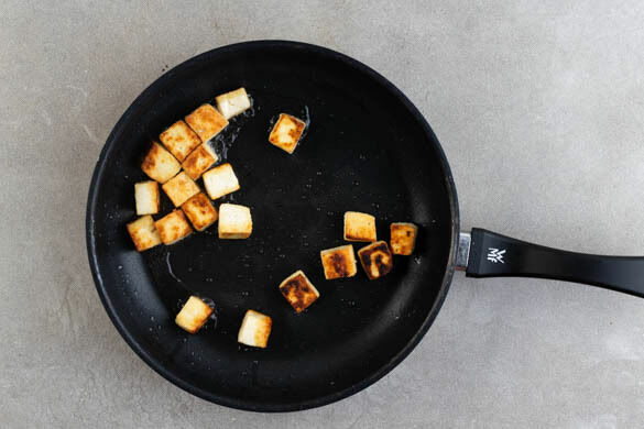 Den Tofu trocken tupfen, in ca. 2cm große Würfel schneiden und mit 2EL Mehl sowie 1TL Salz vermengen. Die Tofuwürfel in einer zweiten großen Pfanne mit 4EL Pflanzenöl bei mittlerer bis starker Hitze rundum in 5–7Min. goldbraun braten. Tipp: Nur wenig umrühren, damit der Tofu schön knusprig wird.